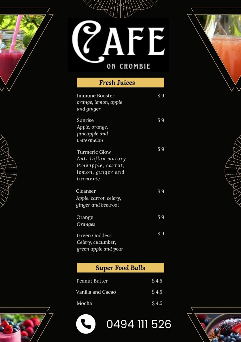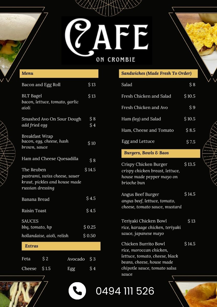 Welcome to Cafe on Crombie, a delightful haven nestled at 31 Crombie Ave, Bundall. This charming café promises a menu that is both refreshing and satisfying. Indulge in their range of Burgers, Bowls & Baos, featuring the crispy chicken burger and the juicy Angus beef burger that delight with each bite. For something lighter, the Teriyaki chicken bowl and chicken burrito bowl offer a burst of flavors made from fresh ingredients.