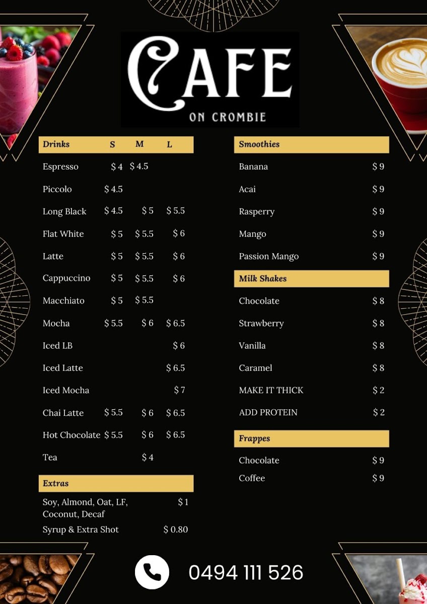 But it doesn't stop there. Cafe on Crombie boasts an impressive drink menu with aromatic coffees like espressos and flat whites, perfect for any coffee enthusiast. Milkshakes in classic flavors provide a sweet treat for those craving something extra.